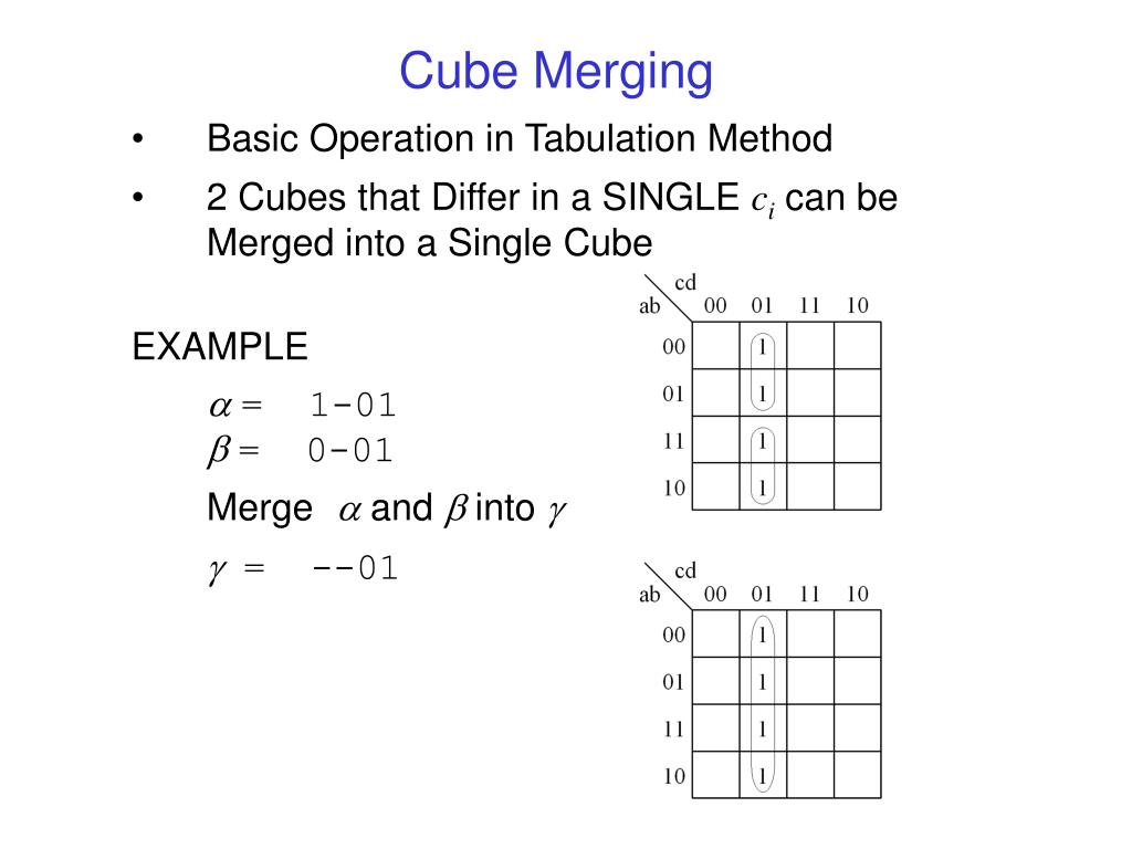 Cube Merging • Basic Operation in Tabulation Method • 2 Cubes that Differ in a SINGLE ci can be Merged into a Single Cube EXAMPLE = 1-01= 0-01 Merge and into = --01