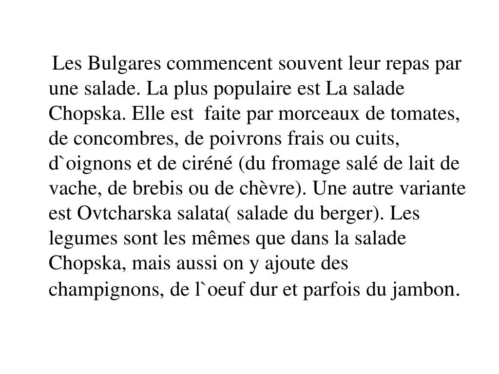 Les Bulgares commencentsouventleurrepasparunesalade. LapluspopulaireestLasaladeChopska. Elleestfaiteparmorceauxdetomates, deconcombres, depoivronsfraisoucuits, d`oignonsetdeciréné (dufromagesalédelaitdevache, debrebisoudechèvre). UneautrevarianteestOvtcharskasalata( saladeduberger). LeslegumessontlesmêmesquedanslasaladeChopska, maisaussion y ajoutedeschampignons, del`oeufduretparfoisdujambon.