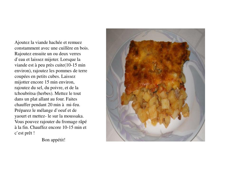 Moussakabulgare Ingrédients : pour 3 personnes 200 g viande hachée( porc ou boeuf), 2 kg pommes de terre, 1 carotte, 1 oignon, 3-4 gousses d`ail, 1 tomate( pas très grande), 1 oeuf, 200 g yaourt nature non sucré, 2 cuillères à soupe d`huile. Coupez d`abord l`oignon, les gousses d`ail en morceaux très fins. Mettez -les dans une casserole, dans l`huile déjà chauffée. Entre temps coupez la carotte et la tomate en petits morceaux et mettez-les dans la casserole.