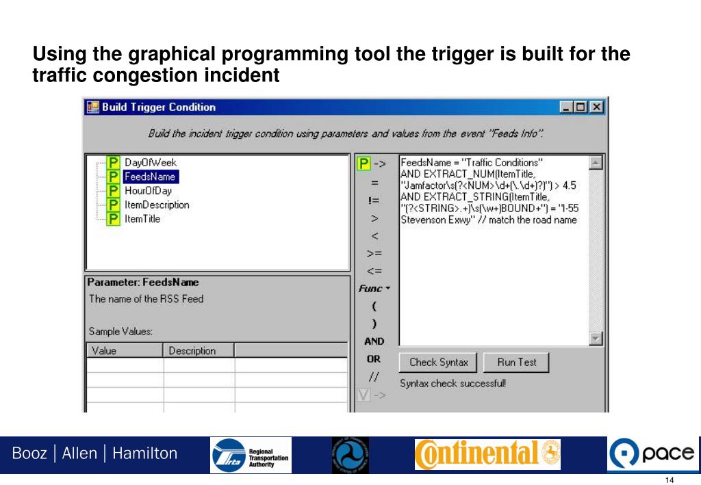 Using the graphical programming tool the trigger is built for the traffic congestion incident