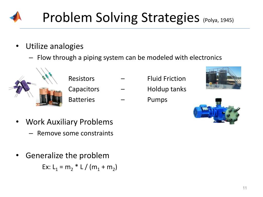 Problem Solving Strategies (Polya, 1945) • Utilize analogies • Flow through a piping system can be modeled with electronics Resistors – Fluid Friction Capacitors – Holdup tanks Batteries – Pumps • Work Auxiliary Problems • Remove some constraints • Generalize the problem Ex: L1= m2* L / (m1 + m2)