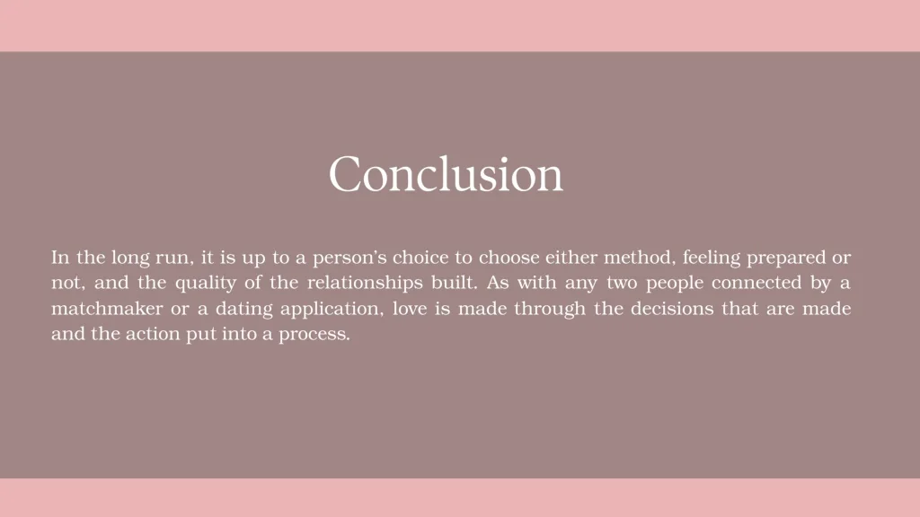 Conclusion In the long run, it is up to a person’s choice to choose either method, feeling prepared or not, and the quality of the relationships built. As with any two people connected by a matchmaker or a dating application, love is made through the decisions that are made and the action put into a process.