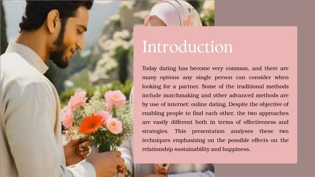 Introduction Today dating has become very common, and there are many options any single person can consider when looking for a partner. Some of the traditional methods include matchmaking and other advanced methods are by use of internet: online dating. Despite the objective of enabling people to find each other, the two approaches are vastly different both in terms of effectiveness and strategies. This presentation analyses these two techniques emphasizing on the possible effects on the relationship sustainability and happiness.