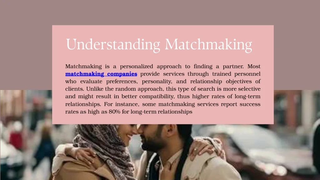 Understanding Matchmaking Matchmaking is a personalized approach to finding a partner. Most matchmaking companies provide services through trained personnel who evaluate preferences, personality, and relationship objectives of clients. Unlike the random approach, this type of search is more selective and might result in better compatibility, thus higher rates of long-term relationships. For instance, some matchmaking services report success rates as high as 80% for long-term relationships