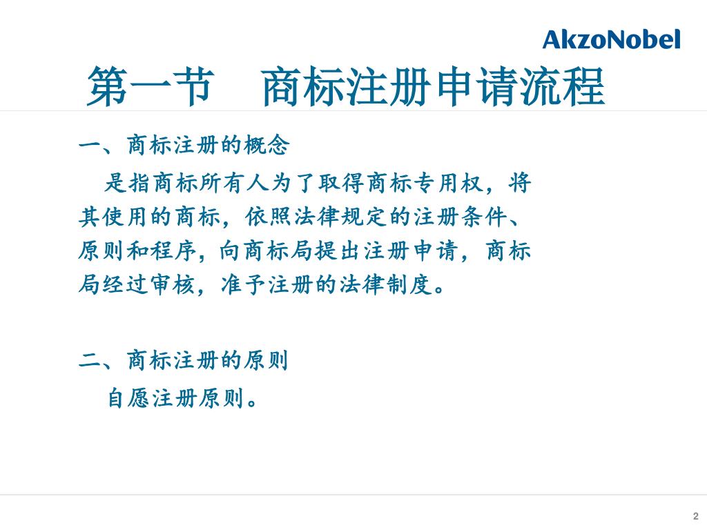 商标 注册申请流程 及 新商标法对企业的影响. 阿克苏诺贝尔 - 陈擎涛. 第一节 商标 注册申请流程. 一、商标注册的 概念 是指商标所有人为了取得商标专用权,将其使用的商标,依照法律规定的注册条件、原则和程序 , 向商标局提出注册申请,商标局经过审核,准予注册的法律制度。 二 、商标注册的原则 自愿注册原则。. 三、商标注册的条件 (一)商标注册的申请人 自然人、法人和其他组织。. (二)申请注册的商标必须具备以下条件: 1 、商标的构成要素必须具有显著特征、便于识别 ;.