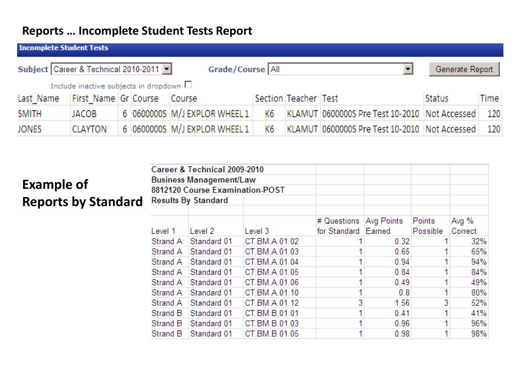 Example ofReports by Standard Reports … Incomplete Student Tests Report
