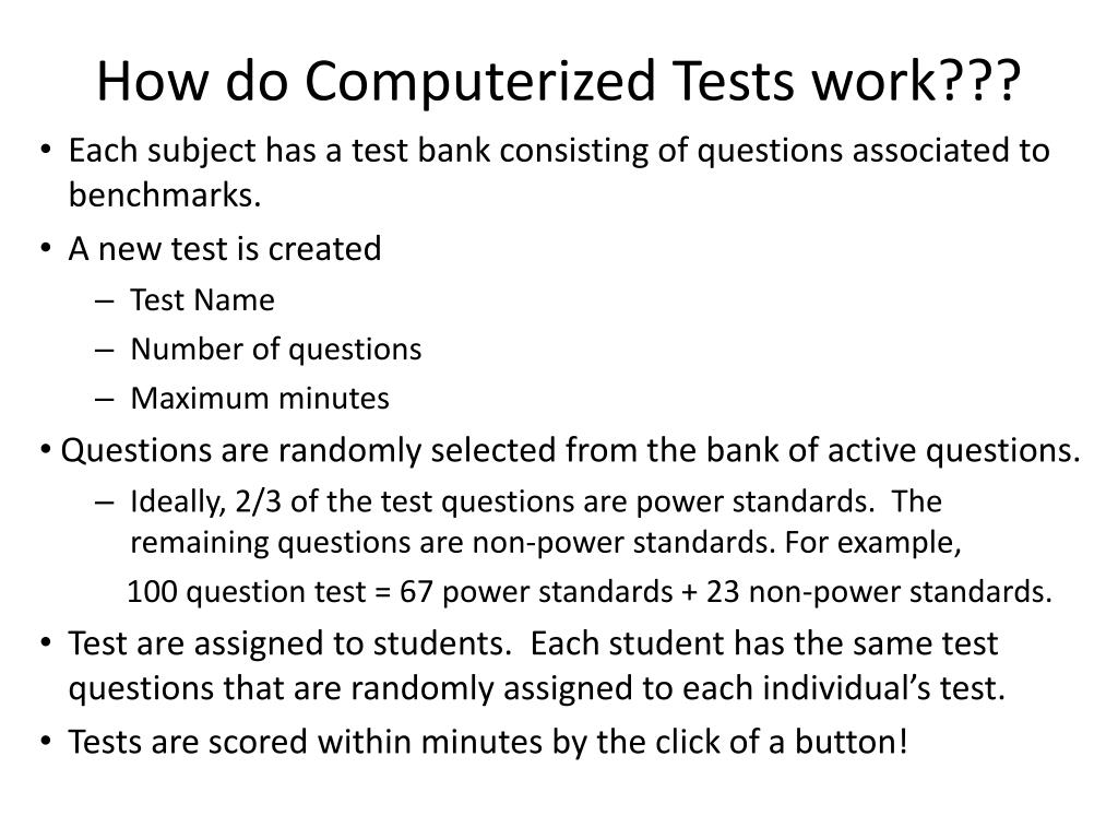 How do Computerized Tests work??? • Each subject has a test bank consisting of questions associated to benchmarks. • A new test is created • Test Name • Number of questions • Maximum minutes • Questions are randomly selected from the bank of active questions. • Ideally, 2/3 of the test questions are power standards. The remaining questions are non-power standards. For example, 100 question test = 67 power standards + 23 non-power standards. • Test are assigned to students. Each student has the same test questions that are randomly assigned to each individual’s test. • Tests are scored within minutes by the click of a button!