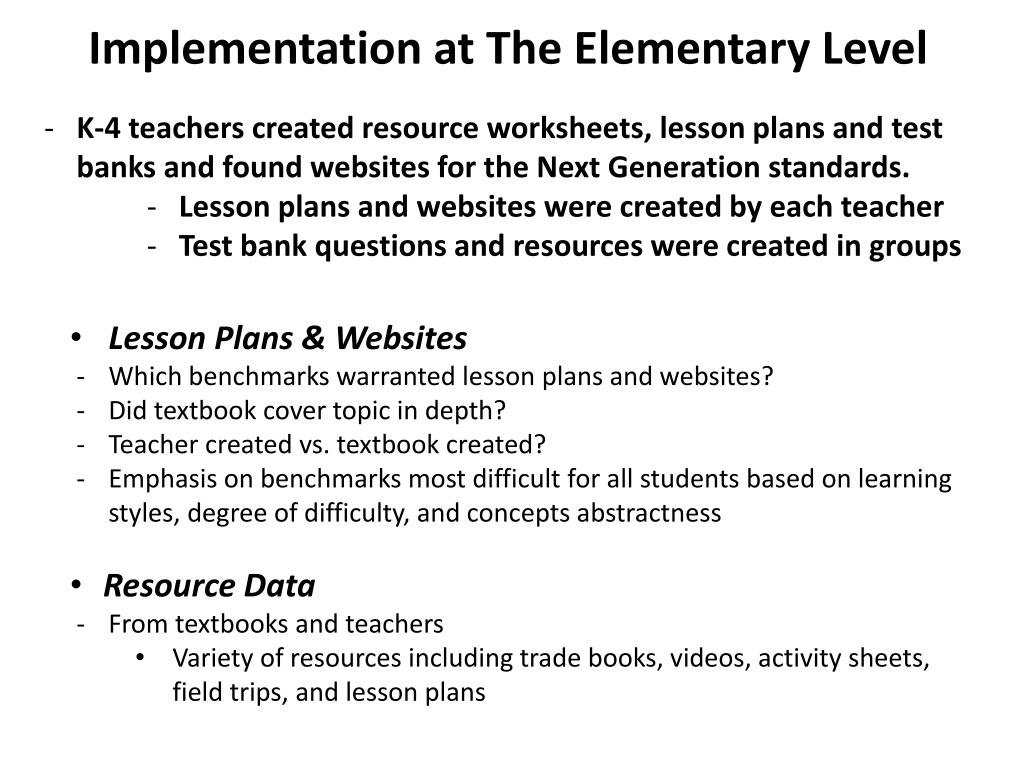 Implementation at The Elementary Level • K-4 teachers created resource worksheets, lesson plans and test banks and found websites for the Next Generation standards. • Lesson plans and websites were created by each teacher • Test bank questions and resources were created in groups • Lesson Plans & Websites • Which benchmarks warranted lesson plans and websites? • Did textbook cover topic in depth? • Teacher created vs. textbook created? • Emphasis on benchmarks most difficult for all students based on learning styles, degree of difficulty, and concepts abstractness • Resource Data • From textbooks and teachers • Variety of resources including trade books, videos, activity sheets, field trips, and lesson plans
