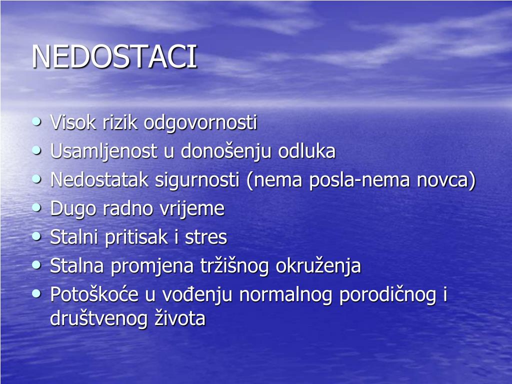 NEDOSTACI • Visok rizik odgovornosti • Usamljenost u donošenju odluka • Nedostatak sigurnosti (nema posla-nema novca) • Dugo radno vrijeme • Stalni pritisak i stres • Stalna promjena tržišnog okruženja • Potoškoće u vođenju normalnog porodičnog i društvenog života