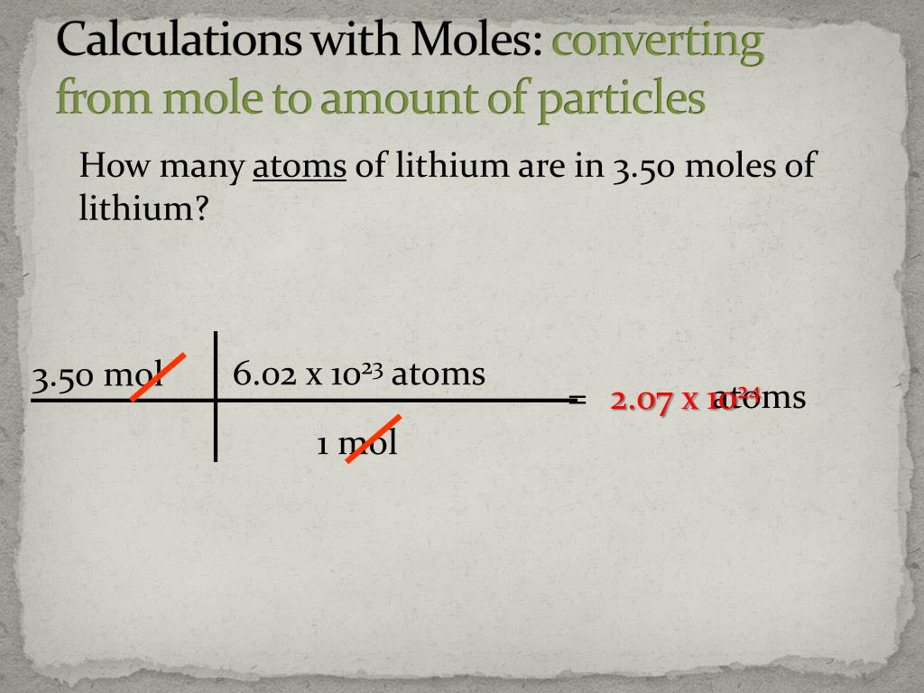 Calculations with Moles: converting from mole to amount of particles How many atoms of lithium are in 3.50 moles of lithium? 6.02 x 1023 atoms 3.50 mol = atoms 2.07 x 1024 1 mol