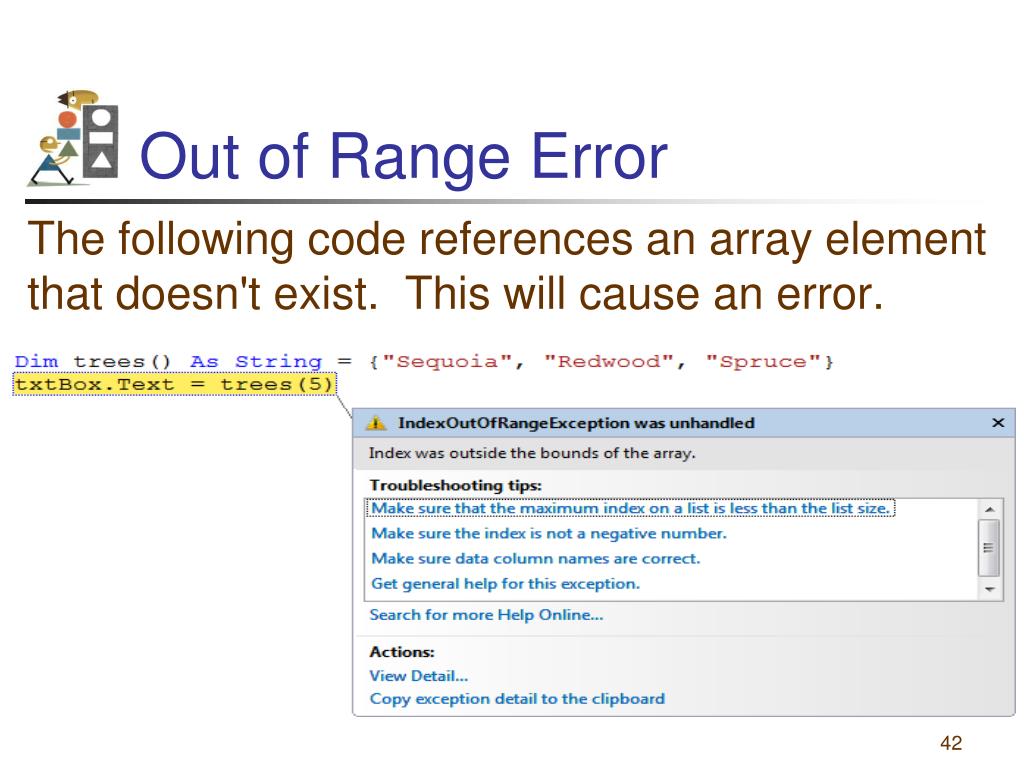 Out of Range Error The following code references an array element that doesn't exist. This will cause an error.