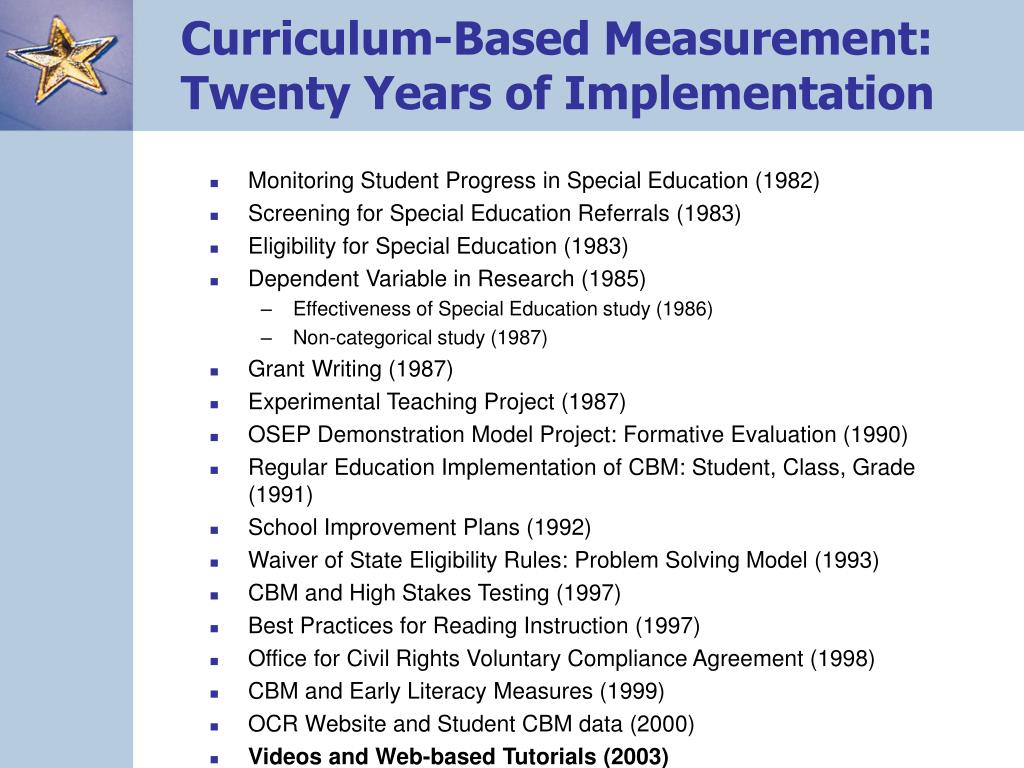 Curriculum-Based Measurement: Twenty Years of Implementation • Monitoring Student Progress in Special Education (1982) • Screening and Eligibility for Special Education Referrals (1983) • Dependent Variable in Research (1985) • Effectiveness of Special Education study (1986) • Non-categorical study (1987) • Grant Writing (1987) • Experimental Teaching Project (1987) • OSEP Demonstration Model Project: Formative Evaluation (1990) • Regular Education Implementation of CBM: Student, Class, Grade (1991) • School Improvement Plans (1992) • Waiver of State Eligibility Rules: Problem Solving Model (1993) • CBM and High Stakes Testing (1997) • Best Practices for Reading Instruction (1997) • Office for Civil Rights Voluntary Compliance Agreement (1998) • CBM and Early Literacy Measures (1999) • OCR Website and Student CBM data (2000) • Videos and Web-based Tutorials (2003)