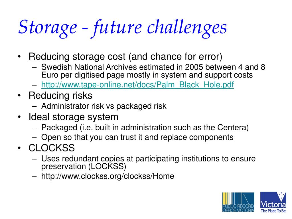 Storage - future challenges • Reducing storage cost (and chance for error) • Swedish National Archives estimated in 2005 between 4 and 8 Euro per digitised page mostly in system and support costs • http://www.tape-online.net/docs/Palm_Black_Hole.pdf • Reducing risks • Administrator risk vs packaged risk • Ideal storage system • Packaged (i.e. built in administration such as the Centera) • Open so that you can trust it and replace components • CLOCKSS • Uses redundant copies at participating institutions to ensure preservation (LOCKSS) • http://www.clockss.org/clockss/Home