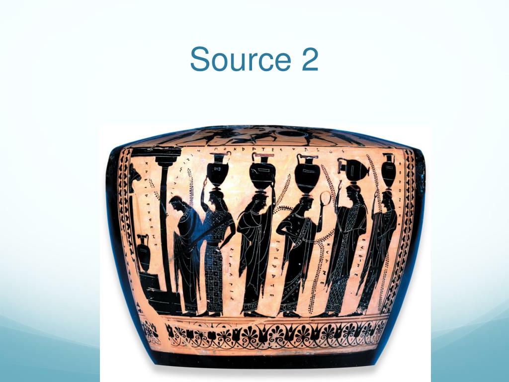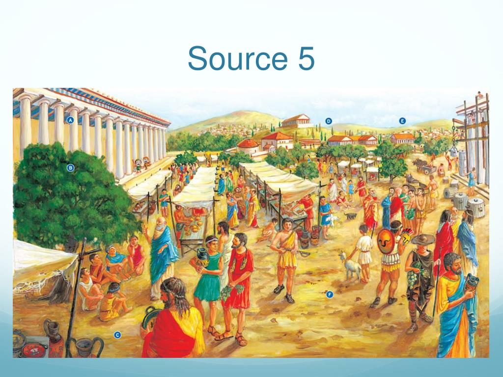 Source 5 Cont • The agora was the political, legal, commercial and social heart of the city in ancient Greece. • A - Public buildings surrounding the Agora in Athens included in the law courts (Heliaea), the mint, the military headquarters (Strategeion) and the Bouleuterion (meeting place of the Council of 500). • B - Plays were first held in the Agora and later in special amphitheatres. They began as religious ceremonies in honour of the Greek god Dionysus. He was the god of wine and merriment. • C - Athenian pots were usually decorated with detailed scenes of daily life and with the stories of myths and legends. • D - Slaves were bought and sold in the Agora. A highly skilled slave might cost 6000 drachma; a simple wooden couch might cost 20 drachma. A drachma was the main silver coin of the ancient Greeks. Before coins were introduced, goods in ancient Greece were bought and sold by bartering. • E - To build columns, ropes and pulleys were used to hoist blocks of stone into position. Metal rods joined each block to the one above and below. • F - The mass of men provided an audience for philosophers such as Socrates. Works by philosophers such as Plato (Socrates' star pupil) and Aristotle (a follower of Plato) have been translated into English.