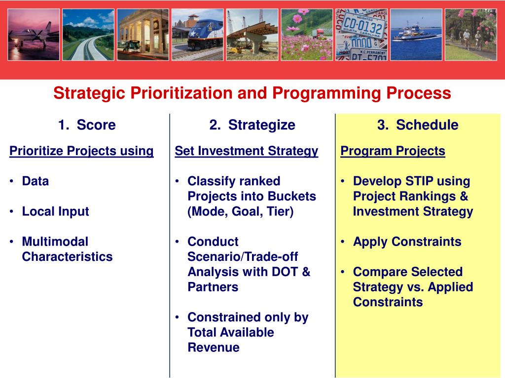 Project Development Time Priority Ranking Prioritization Results ≠ Programming Construction Sequence Investment Strategy TIP Equity Formula Funding Constraints Factors Influencing TIP *Draft 10 Year Plan/STIP expected to be released summer 2012*