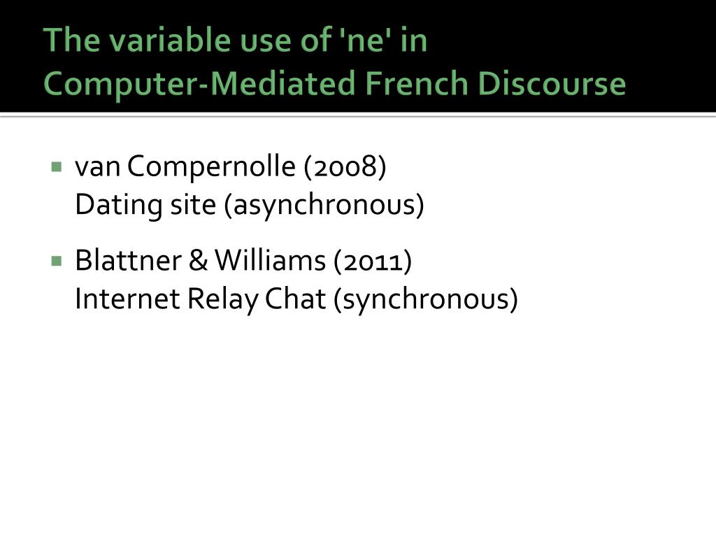 The variable use of 'ne' in Computer-Mediated French Discourse • van Compernolle (2008) Dating site (asynchronous) • Blattner & Williams (2011) Internet Relay Chat (synchronous)