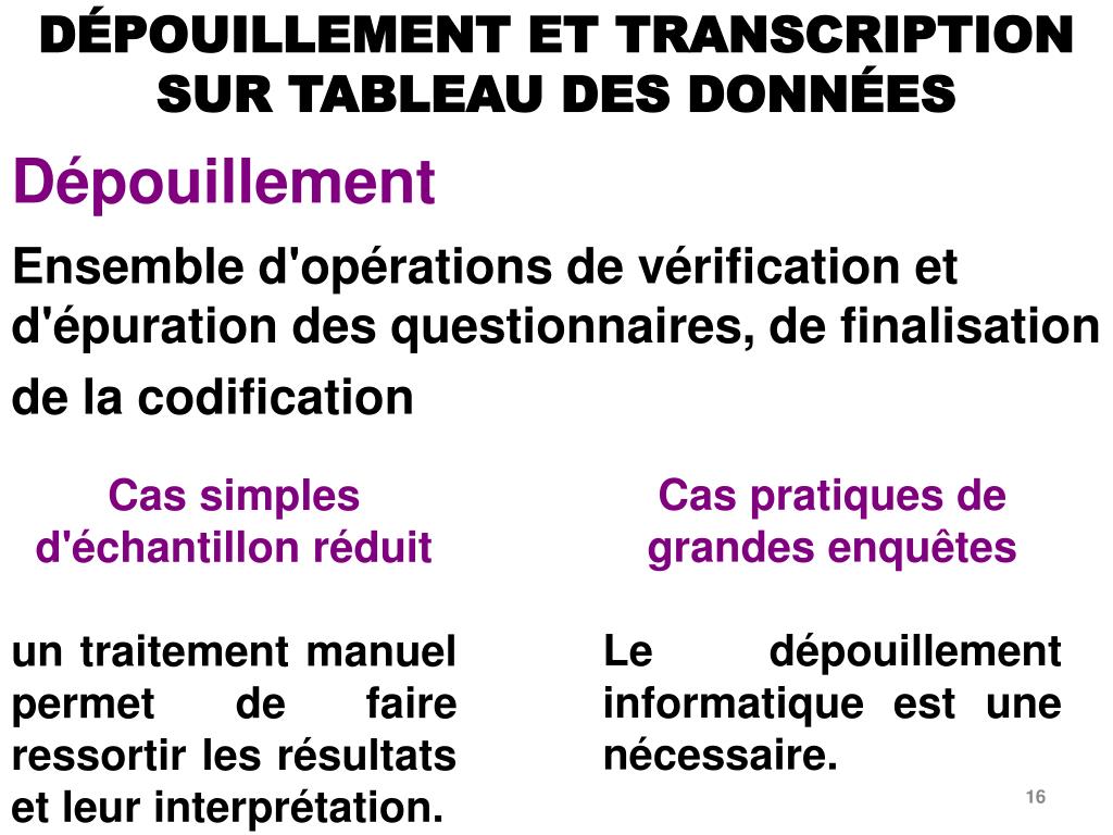 DÉPOUILLEMENT ET TRANSCRIPTION SUR TABLEAU DES DONNÉES Dépouillement Ensemble d'opérations de vérification et d'épuration des questionnaires, de finalisation de la codification Cas pratiques de grandes enquêtes Le dépouillement informatique est une nécessaire. Cas simples d'échantillon réduit un traitement manuel permet de faire ressortir les résultats et leur interprétation.