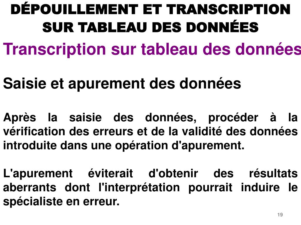 DÉPOUILLEMENT ET TRANSCRIPTION SUR TABLEAU DES DONNÉES Transcription sur tableau des données Saisie et apurement des données Après la saisie des données, procéder à la vérification des erreurs et de la validité des données introduite dans une opération d'apurement. L'apurement éviterait d'obtenir des résultats aberrants dont l'interprétation pourrait induire le spécialiste en erreur.