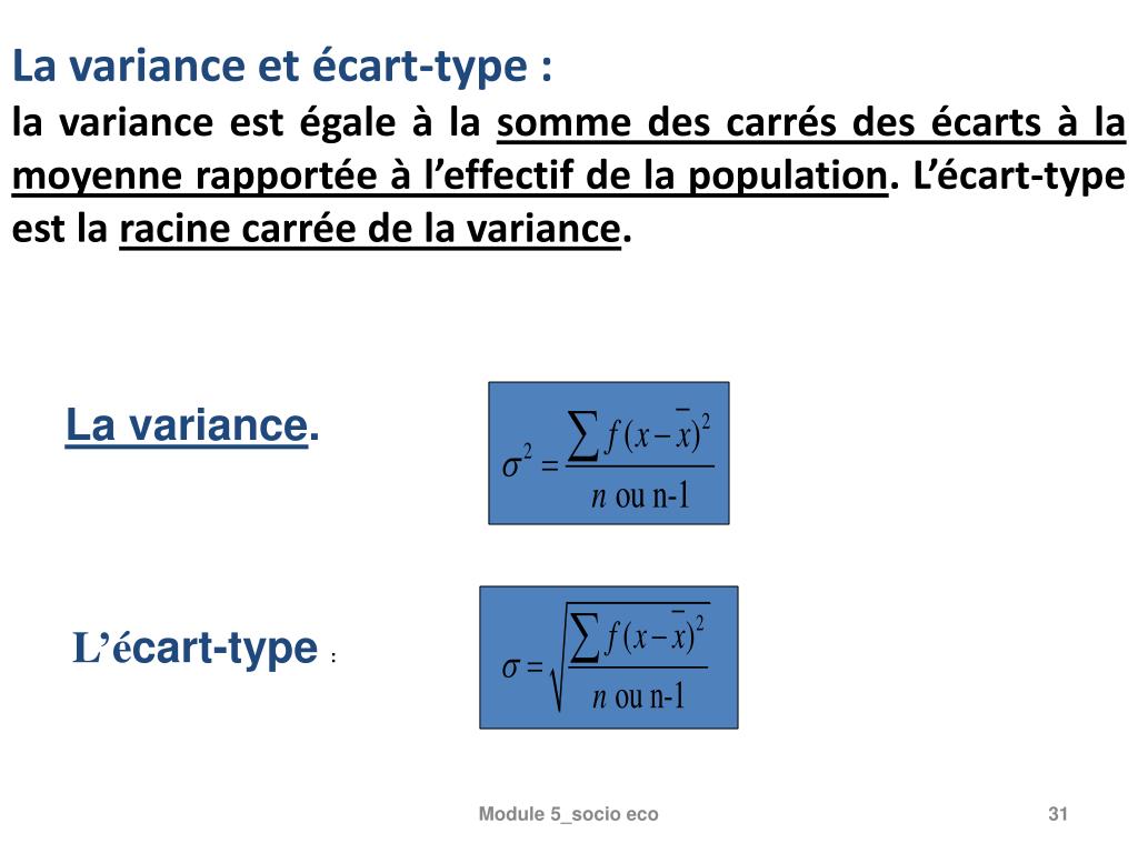 La variance et écart-type : la variance est égale à la somme des carrés des écarts à la moyenne rapportée à l’effectif de la population. L’écart-type est la racine carrée de la variance. La variance. L’écart-type: Module 5_socio eco