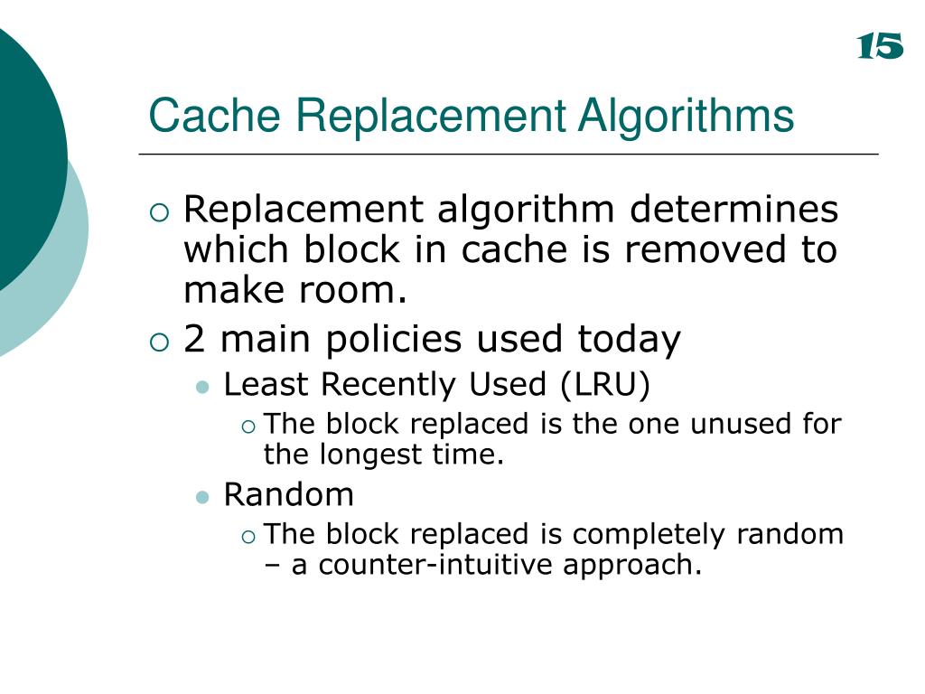 15 Cache Replacement Algorithms • Replacement algorithm determines which block in cache is removed to make room. • 2 main policies used today • Least Recently Used (LRU) • The block replaced is the one unused for the longest time. • Random • The block replaced is completely random – a counter-intuitive approach.