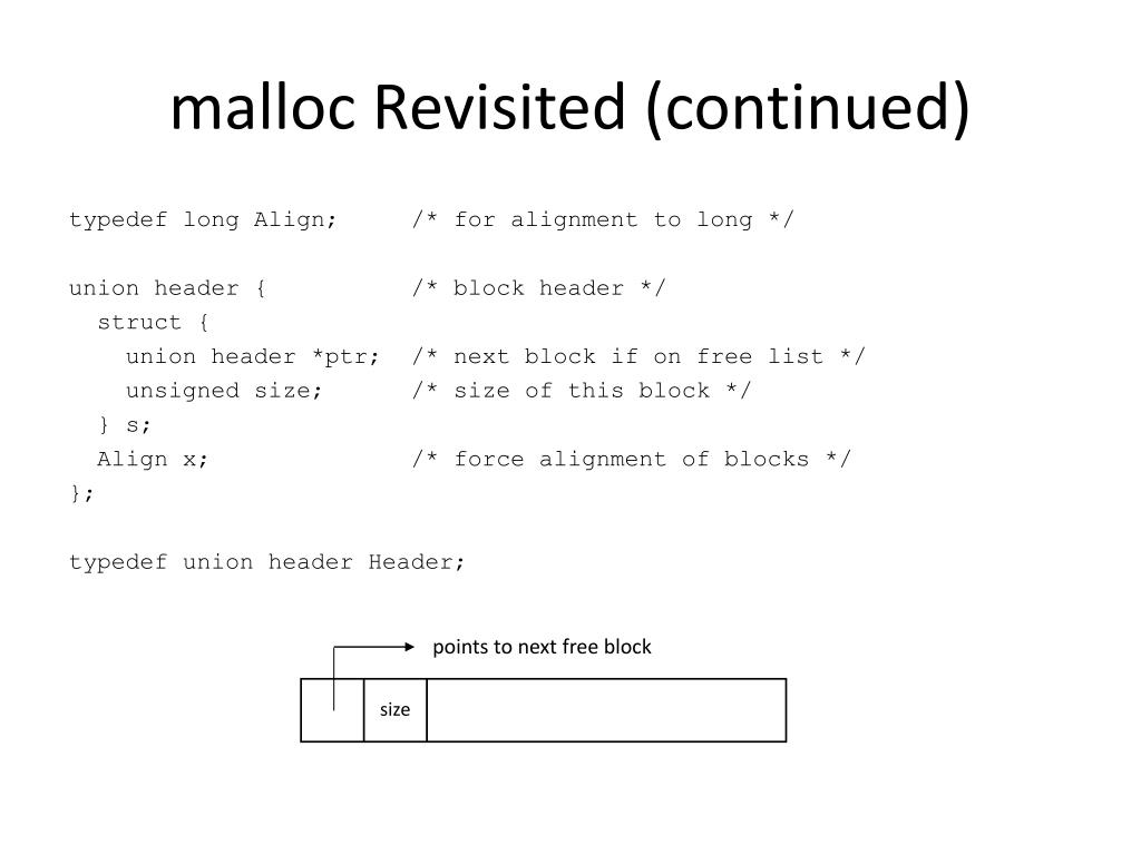 malloc Revisited (continued) typedef long Align; /* for alignment to long */ union header { /* block header */ struct { union header *ptr; /* next block if on free list */ unsigned size; /* size of this block */ } s; Align x; /* force alignment of blocks */ }; typedef union header Header; points to next free block size