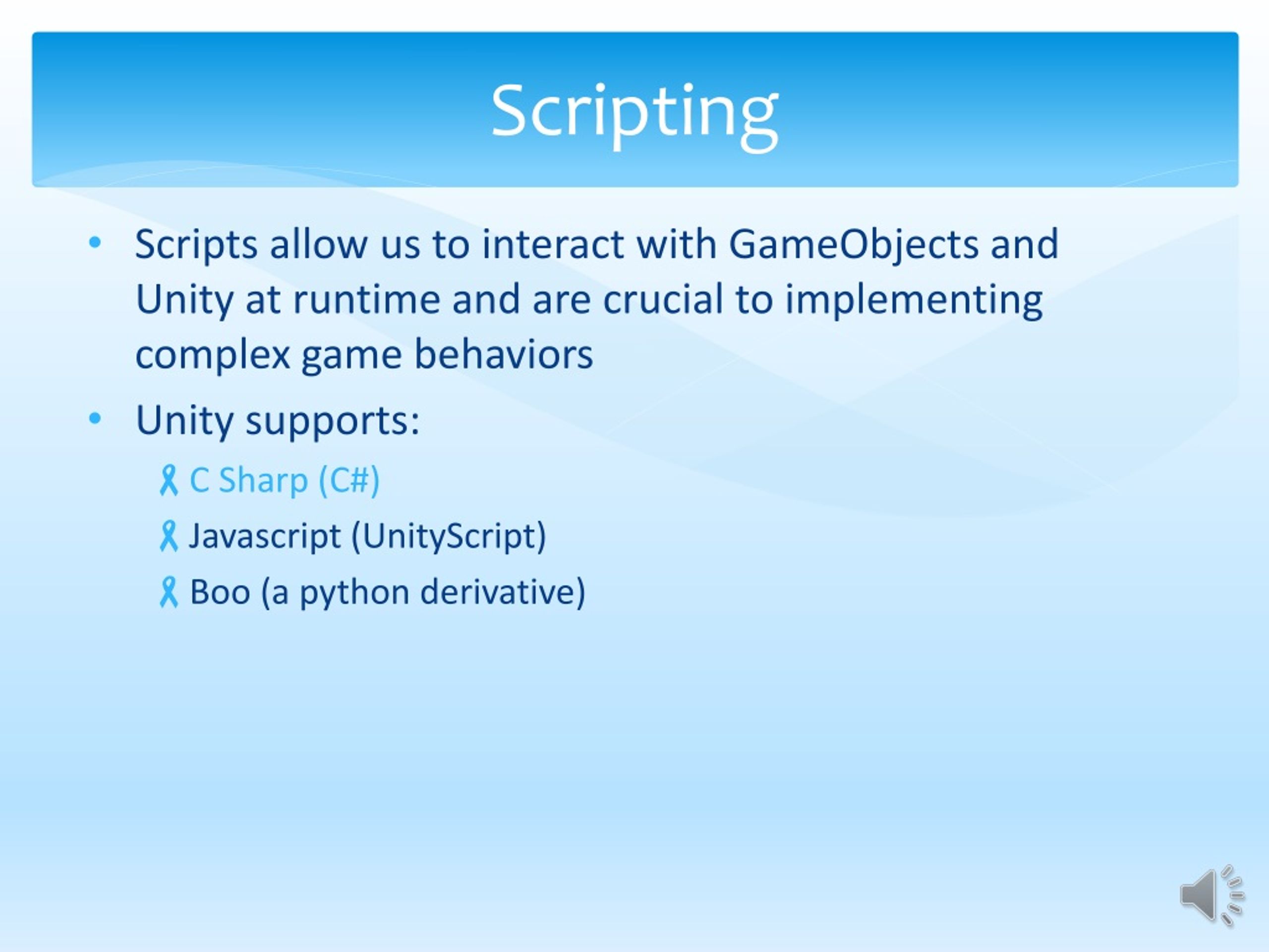 Scripting • Scripts allow us to interact with GameObjects and Unity at runtime and are crucial to implementing complex game behaviors • Unity supports: • C Sharp (C#) • Javascript (UnityScript) • Boo (a python derivative)