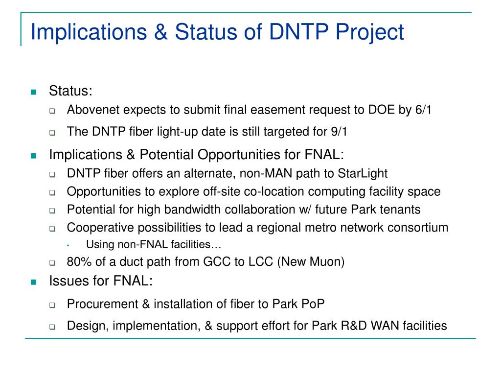 Implications & Status of DNTP Project • Status: • Abovenet expects to submit final easement request to DOE by 6/1 • The DNTP fiber light-up date is still targeted for 9/1 • Implications & Potential Opportunities for FNAL: • DNTP fiber offers an alternate, non-MAN path to StarLight • Opportunities to explore off-site co-location computing facility space • Potential for high bandwidth collaboration w/ future Park tenants • Cooperative possibilities to lead a regional metro network consortium • Using non-FNAL facilities… • 80% of a duct path from GCC to LCC (New Muon) • Issues for FNAL: • Procurement & installation of fiber to Park PoP • Design, implementation, & support effort for Park R&D WAN facilities