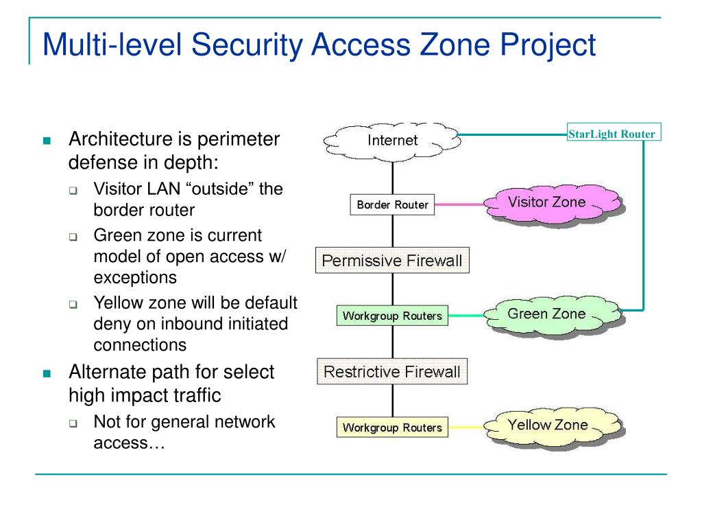Multi-level Security Access Zone Project • Architecture is perimeter defense in depth: • Visitor LAN “outside” the border router • Green zone is current model of open access w/ exceptions • Yellow zone will be default deny on inbound initiated connections • Alternate path for select high impact traffic • Not for general network access… StarLight Router