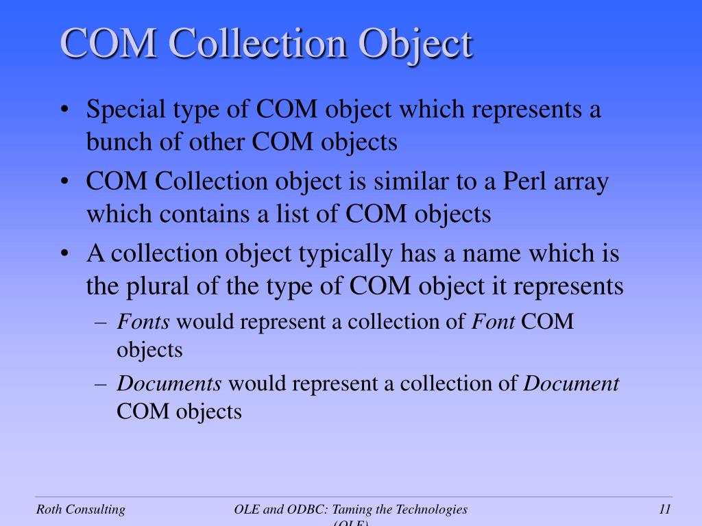 COM Collection Object • Special type of COM object which represents a bunch of other COM objects • COM Collection object is similar to a Perl array which contains a list of COM objects • A collection object typically has a name which is the plural of the type of COM object it represents • Fonts would represent a collection of Font COM objects • Documents would represent a collection of Document COM objects OLE and ODBC: Taming the Technologies (OLE)