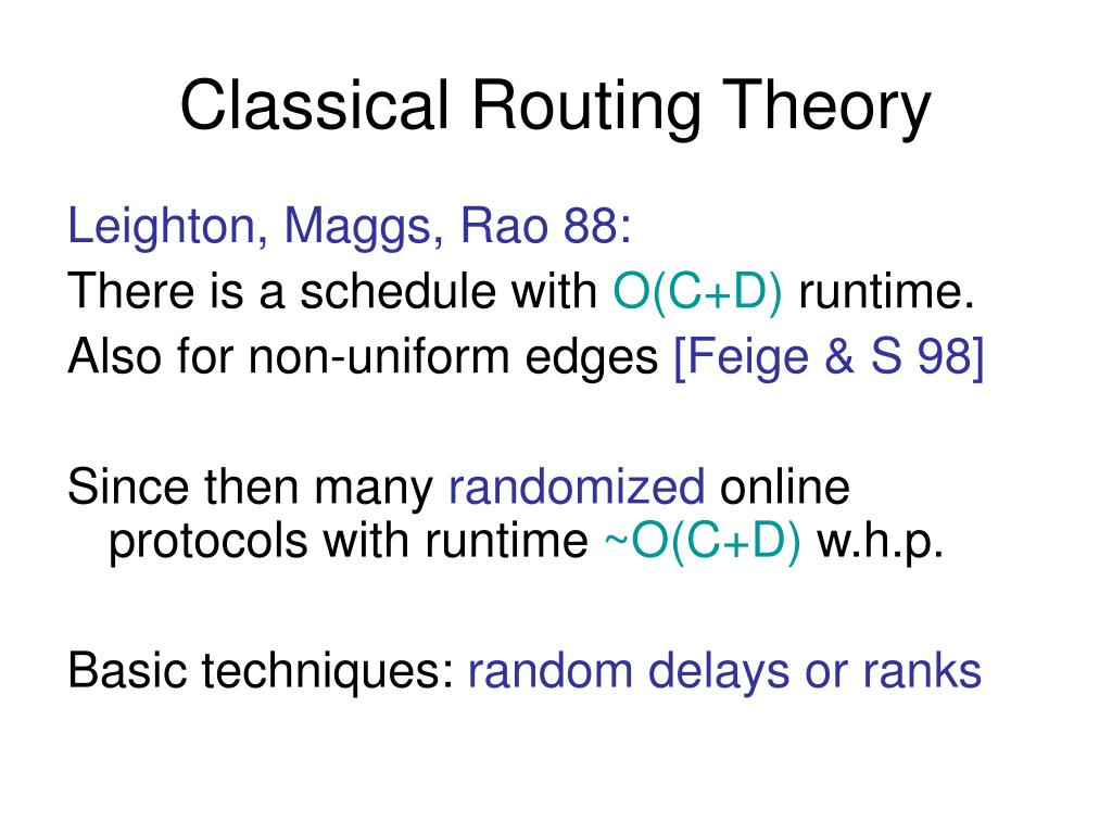 Classical Routing Theory Leighton, Maggs, Rao 88: There is a schedule with O(C+D) runtime. Also for non-uniform edges [Feige & S 98] Since then many randomized online protocols with runtime ~O(C+D) w.h.p. Basic techniques: random delays or ranks
