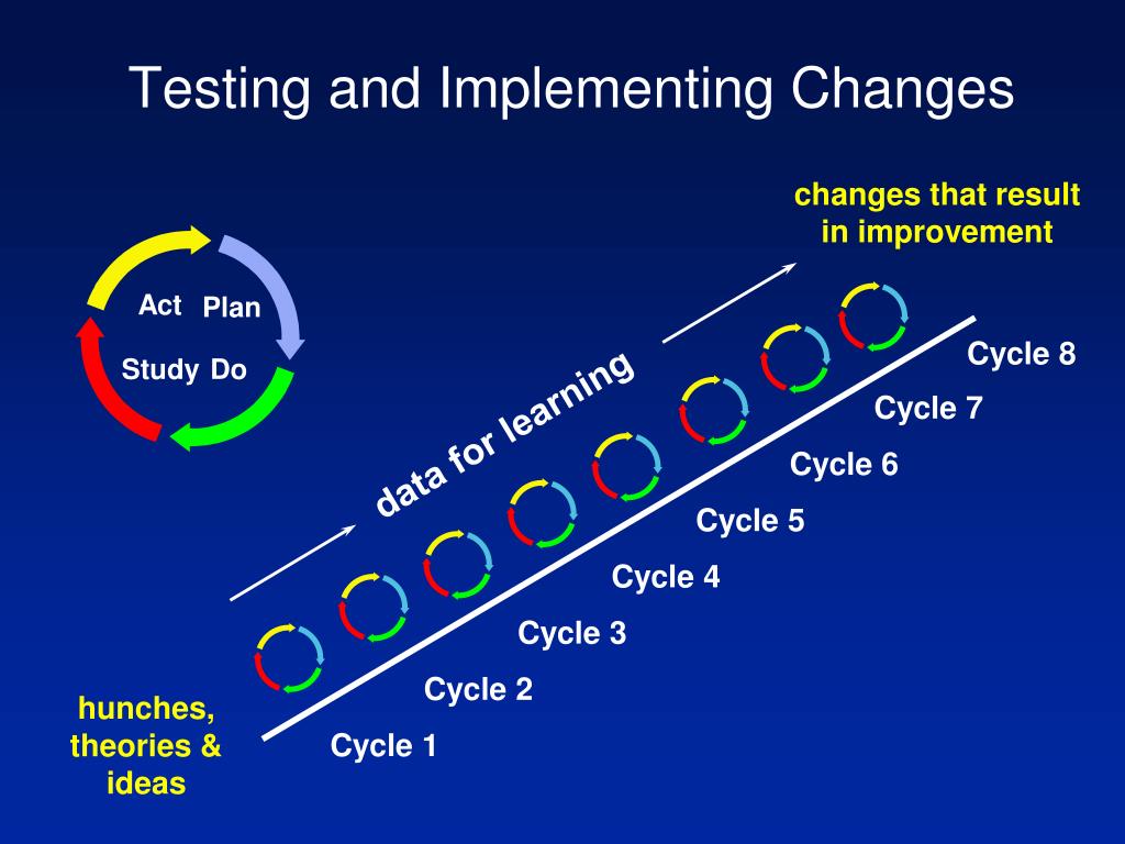 Act Study Do Cycle 4 Cycle 3 Cycle 2 Cycle 1 Testing and Implementing Changes changes that result in improvement Plan Cycle 8 Cycle 7 data for learning Cycle 6 Cycle 5 hunches, theories & ideas