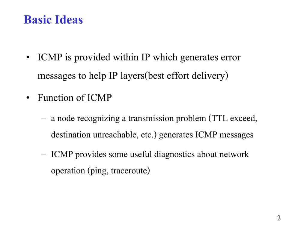 Basic Ideas • ICMP is provided within IP which generates error messages to help IP layers(best effort delivery) • Function of ICMP • a node recognizing a transmission problem (TTL exceed, destination unreachable, etc.) generates ICMP messages • ICMP provides some useful diagnostics about network operation (ping, traceroute)