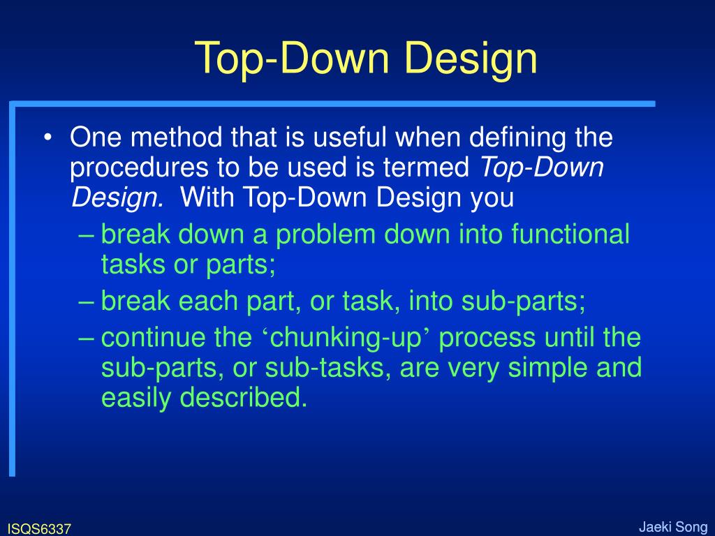 Top-Down Design • One method that is useful when defining the procedures to be used is termed Top-Down Design. With Top-Down Design you • break down a problem down into functional tasks or parts; • break each part, or task, into sub-parts; • continue the ‘chunking-up’ process until the sub-parts, or sub-tasks, are very simple and easily described.