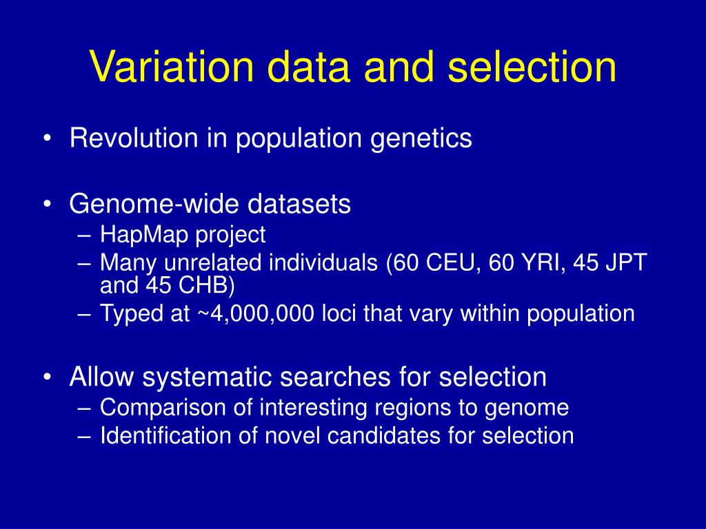 Variation data and selection • Revolution in population genetics • Genome-wide datasets • HapMap project • Many unrelated individuals (60 CEU, 60 YRI, 45 JPT and 45 CHB) • Typed at ~4,000,000 loci that vary within population • Allow systematic searches for selection • Comparison of interesting regions to genome • Identification of novel candidates for selection
