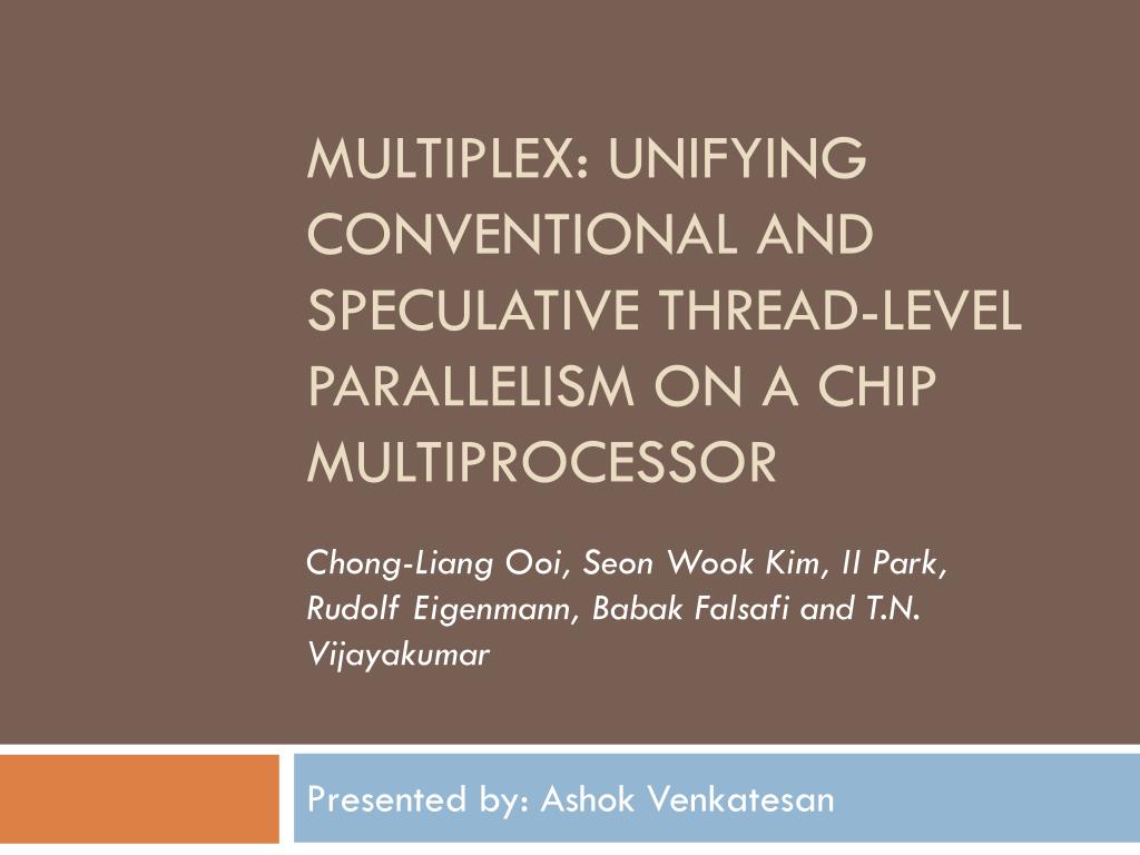 Multiplex: Unifying Conventional and Speculative Thread-Level Parallelism on a Chip Multiprocessor Chong-Liang Ooi, Seon Wook Kim, II Park, Rudolf Eigenmann, Babak Falsafi and T.N. Vijayakumar Presented by: Ashok Venkatesan