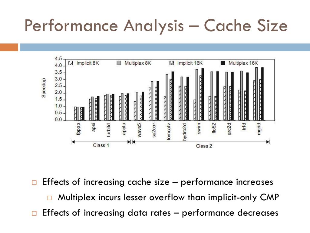 Performance Analysis – Cache Size • Effects of increasing cache size – performance increases • Multiplex incurs lesser overflow than implicit-only CMP • Effects of increasing data rates – performance decreases
