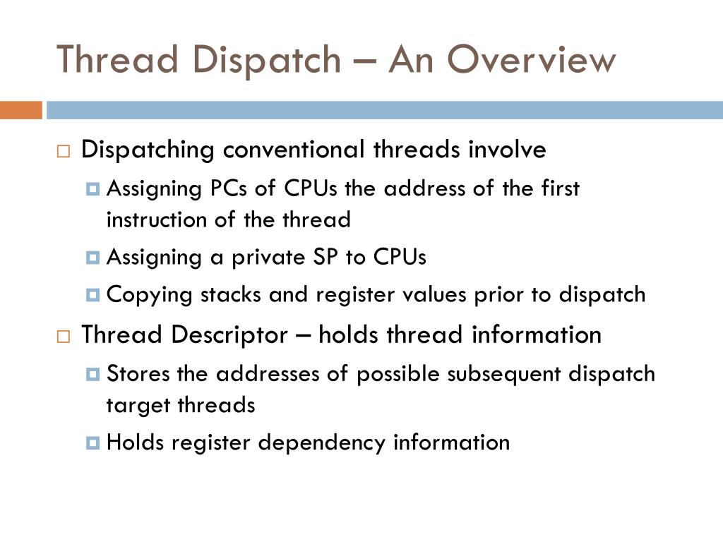 Thread Dispatch – An Overview • Dispatching conventional threads involve • Assigning PCs of CPUs the address of the first instruction of the thread • Assigning a private SP to CPUs • Copying stacks and register values prior to dispatch • Thread Descriptor – holds thread information • Stores the addresses of possible subsequent dispatch target threads • Holds register dependency information