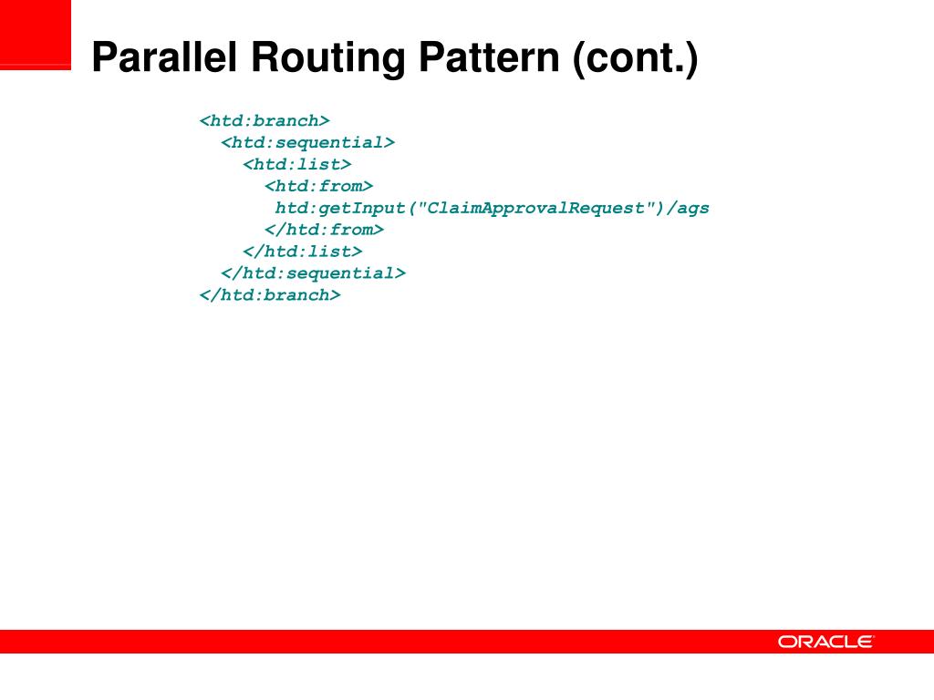 Parallel Routing Pattern (cont.) <htd:branch> <htd:sequential> <htd:list> <htd:from> htd:getInput("ClaimApprovalRequest")/ags </htd:from> </htd:list> </htd:sequential> </htd:branch>