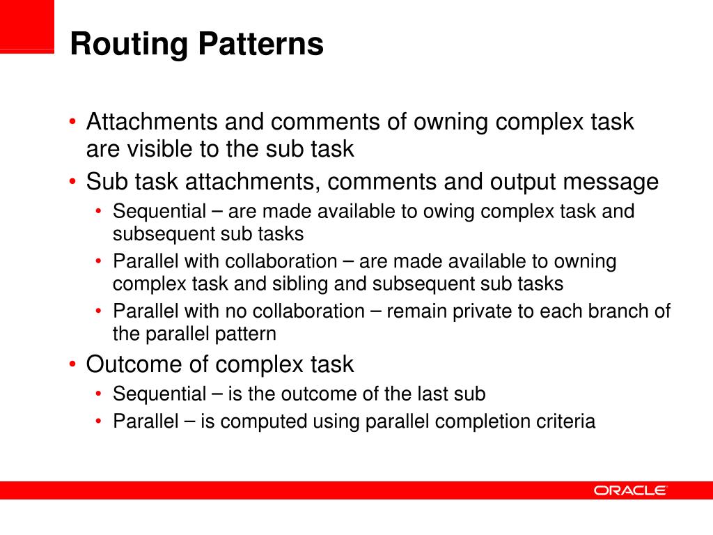 Routing Patterns • Attachments and comments of owning complex task are visible to the sub task • Sub task attachments, comments and output message • Sequential – are made available to owing complex task and subsequent sub tasks • Parallel with collaboration – are made available to owning complex task and sibling and subsequent sub tasks • Parallel with no collaboration – remain private to each branch of the parallel pattern • Outcome of complex task • Sequential – is the outcome of the last sub • Parallel – is computed using parallel completion criteria