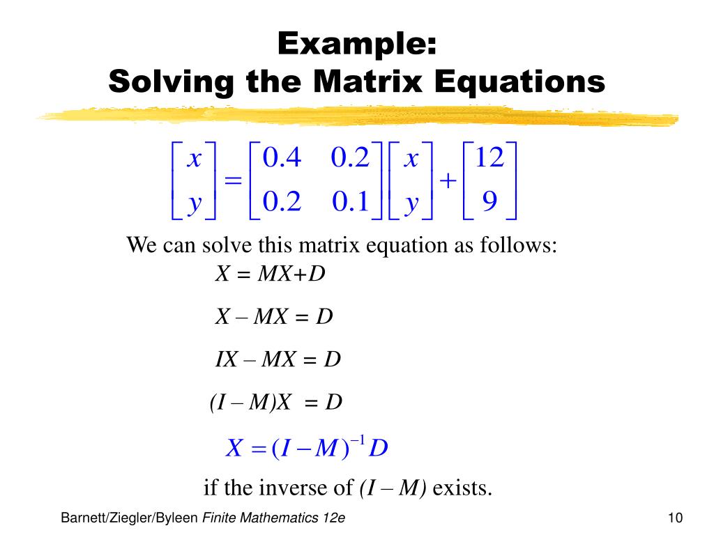 Example:Solving the Matrix Equations We can solve this matrix equation as follows: X = MX+D X – MX = D IX – MX = D (I – M)X = D if the inverse of (I – M) exists. Barnett/Ziegler/Byleen Finite Mathematics 12e