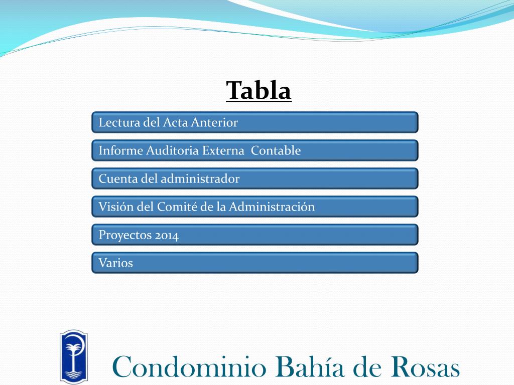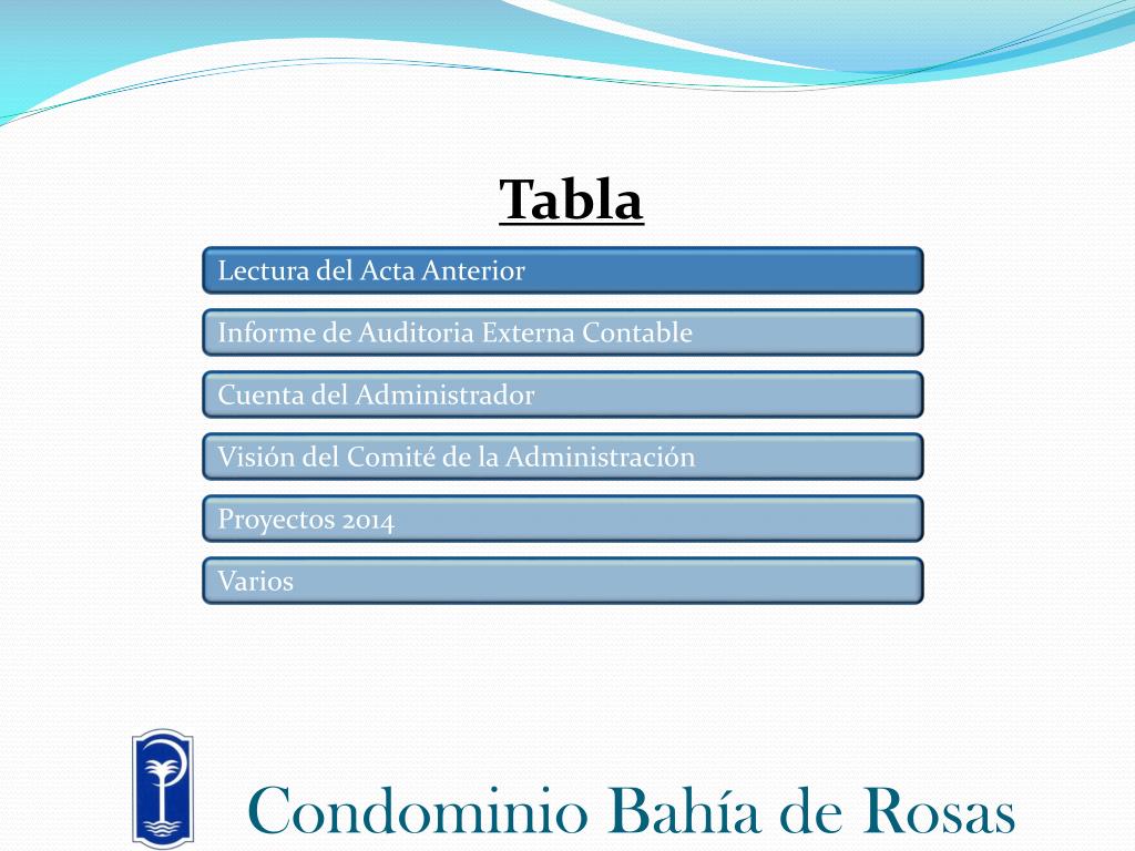 Condominio Bahía de Rosas. Rendición 2013. Tabla. Lectura del Acta Anterior. Informe Auditoria Externa Contable. Cuenta del administrador. Visión del Comité de la Administración. Proyectos 2014. Varios. Condominio Bahía de Rosas. Tabla. Lectura del Acta Anterior.