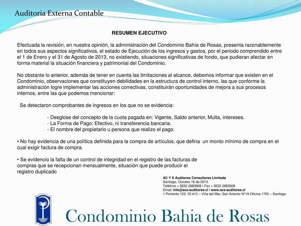 Auditoria Externa Contable • RESUMEN EJECUTIVO • Efectuada la revisión, en nuestra opinión, la administración del Condominio Bahía de Rosas, presenta razonablemente en todos sus aspectos significativos, el estado de Ejecución de los ingresos y gastos, por el periodo comprendido entre el 1 de Enero y el 31 de Agosto de 2013, no existiendo, situaciones significativas de fondo, que pudieran afectar en forma material la situación financiera y patrimonial del Condominio. • No obstante lo anterior, además de tener en cuenta las limitaciones al alcance, debemos informar que existen en el Condominio, observaciones que constituyen debilidades en la estructura de control interno, las que conforme la administración logre implementar las acciones correctivas, constituirán oportunidades de mejora a sus procesos internos, entre las que podemos mencionar: • Se detectaron comprobantes de ingresos en los que no se evidencia: • - Desglose del concepto de la cuota pagada en: Vigente, Saldo anterior, Multa, intereses. • - La Forma de Pago: Efectivo, ni transferencia bancaria. • El nombre del propietario u persona que realizo el pago. • No hay evidencia de una política definida para la compra de artículos, que defina un monto mínimo de compra en el cual exigir factura de compra. • Se evidencio la falta de un control de integridad en el registro de las facturas de • compras que se recepcionan mensualmente, situación que puede producir el • registro duplicado AC Y S Auditores Consultores Limitada Santiago, Octubre 18 de 2013 Teléfono + 5632 2683908 I Fax + 5632 2683908 Email: info@acs-auditores.cl I www.acs-auditores.cl 1 Poniente 123. Of.413 – Viña del Mar; San Antonio N°19 Oficina 1705 – Santiago Condominio Bahia de Rosas