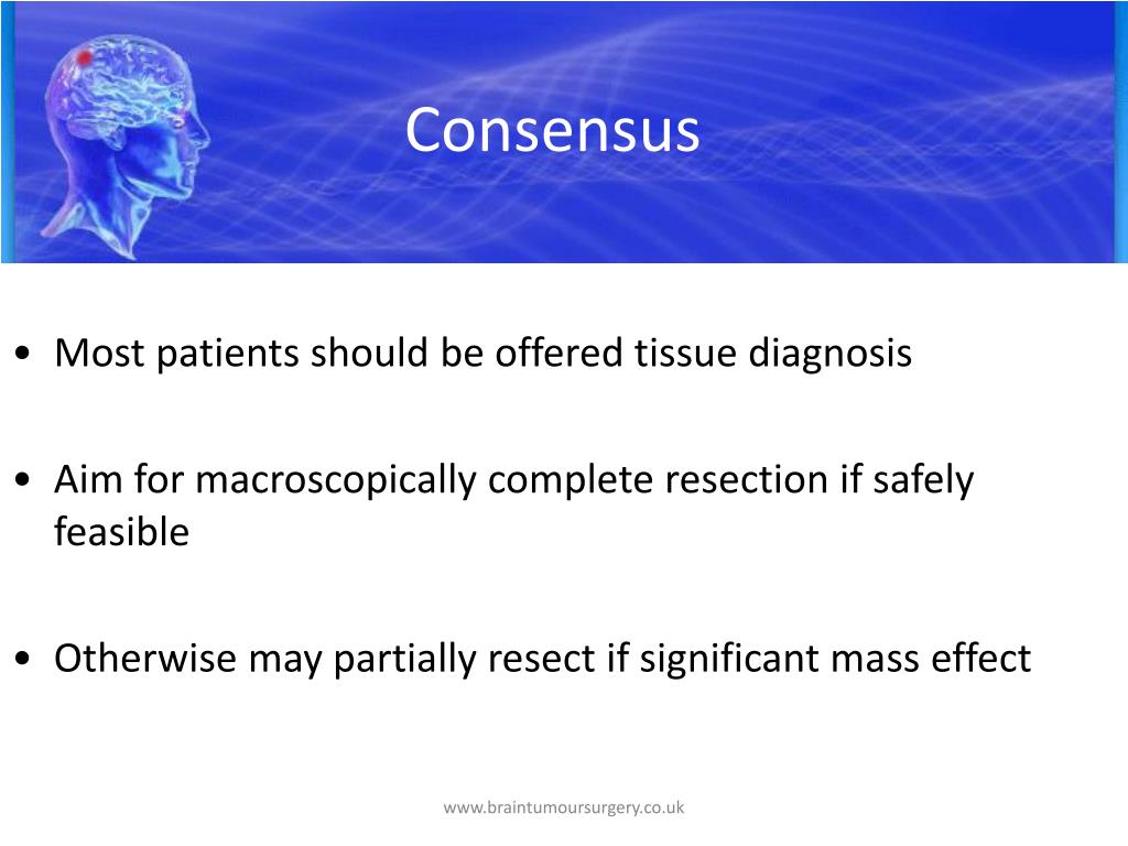 Consensus Consensus • Most patients should be offered tissue diagnosis • Aim for macroscopically complete resection if safely feasible • Otherwise may partially resect if significant mass effect www.braintumoursurgery.co.uk