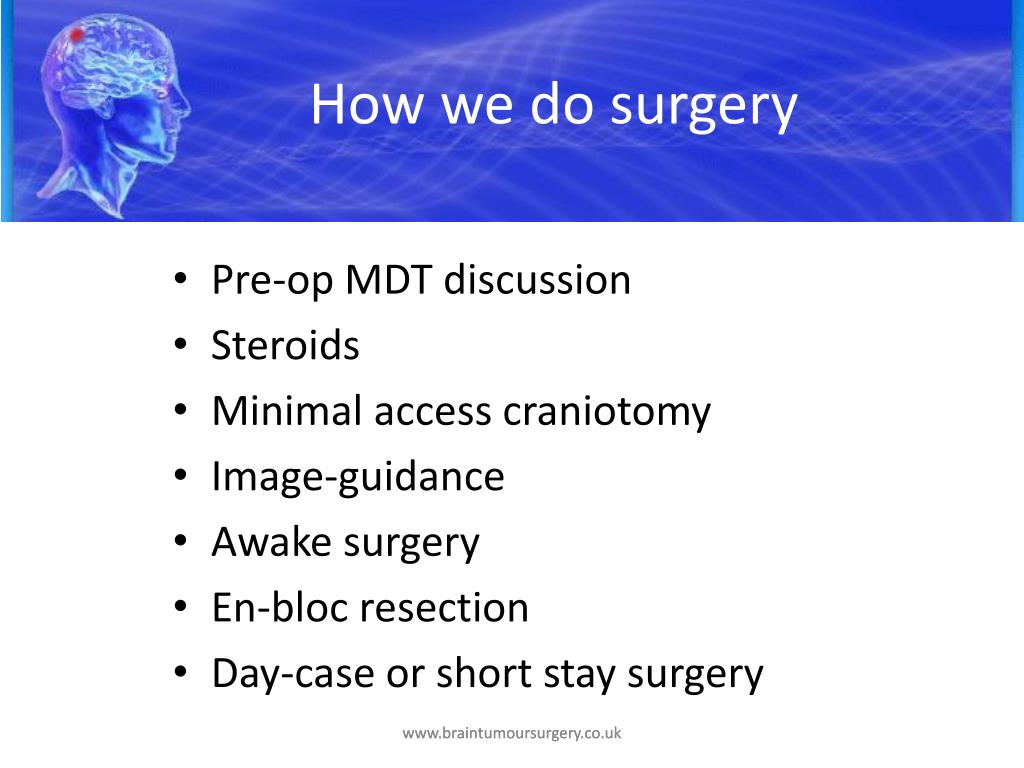 How we do surgery Pre-op MDT discussion Steroids Minimal access craniotomy Image-guidance Awake surgery En-bloc resection Day-case or short stay surgery How we do surgery www.braintumoursurgery.co.uk www.braintumoursurgery.co.uk