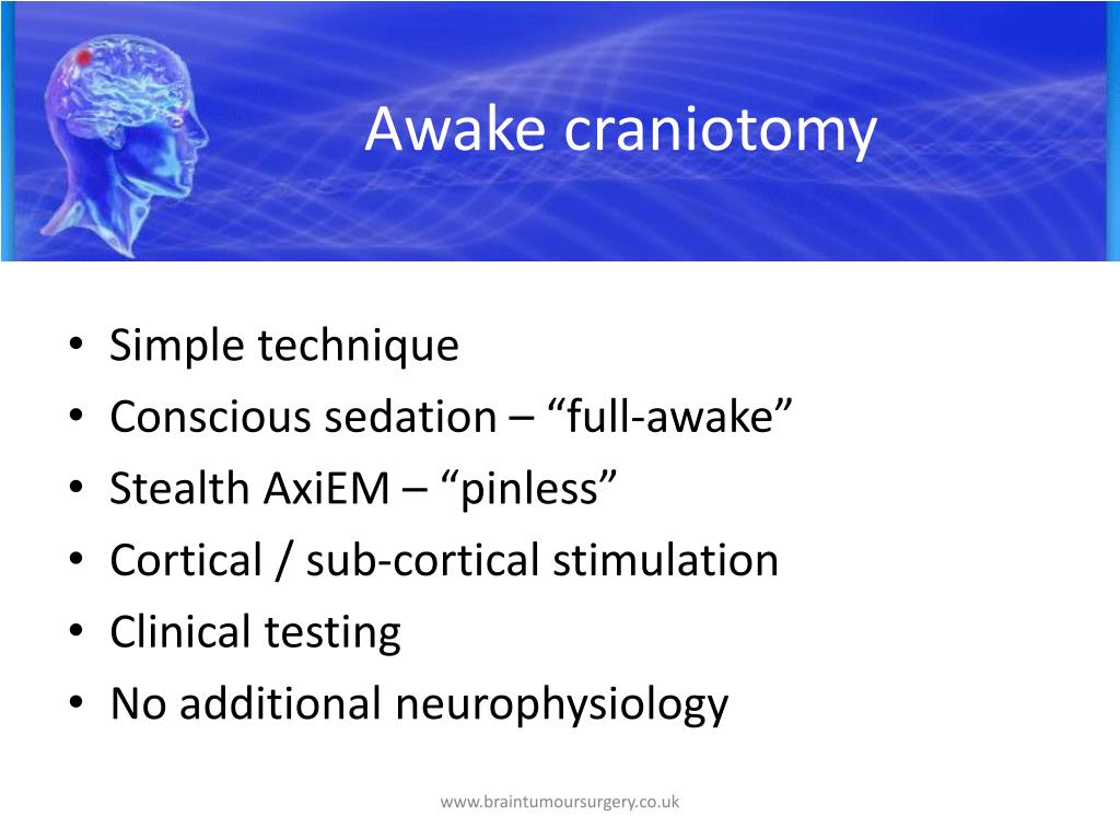 Awake craniotomy • Simple technique • Conscious sedation – “full-awake” • Stealth AxiEM – “pinless” • Cortical / sub-cortical stimulation • Clinical testing • No additional neurophysiology www.braintumoursurgery.co.uk