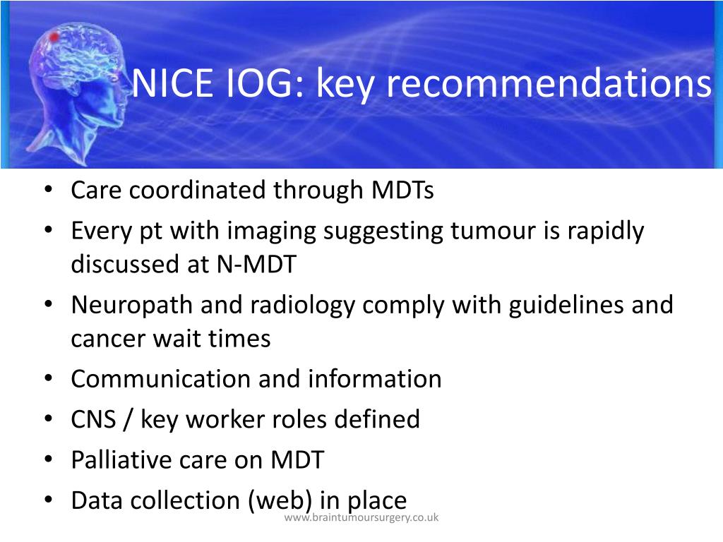 NICE IOG: key recommendations • Care coordinated through MDTs • Every pt with imaging suggesting tumour is rapidly discussed at N-MDT • Neuropath and radiology comply with guidelines and cancer wait times • Communication and information • CNS / key worker roles defined • Palliative care on MDT • Data collection (web) in place www.braintumoursurgery.co.uk