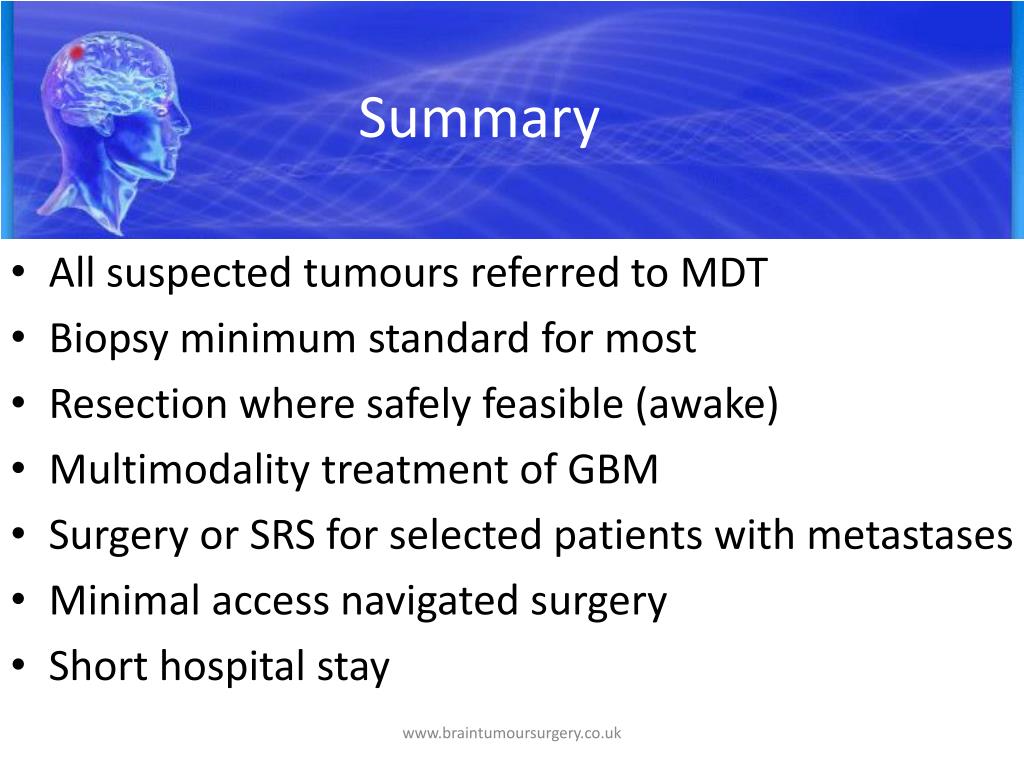 Summary • All suspected tumours referred to MDT • Biopsy minimum standard for most • Resection where safely feasible (awake) • Multimodality treatment of GBM • Surgery or SRS for selected patients with metastases • Minimal access navigated surgery • Short hospital stay www.braintumoursurgery.co.uk