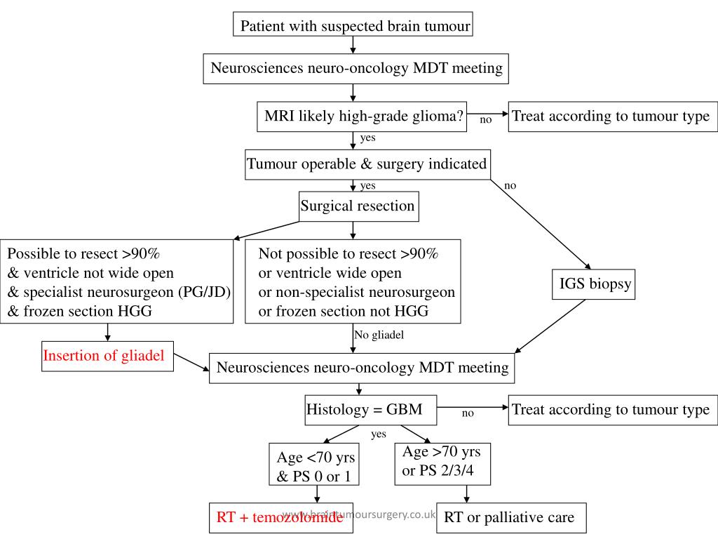 Patient with suspected brain tumour Neurosciences neuro-oncology MDT meeting MRI likely high-grade glioma? Treat according to tumour type no yes Tumour operable & surgery indicated yes no Surgical resection Possible to resect >90% & ventricle not wide open & specialist neurosurgeon (PG/JD) & frozen section HGG Not possible to resect >90% or ventricle wide open or non-specialist neurosurgeon or frozen section not HGG IGS biopsy No gliadel Insertion of gliadel Neurosciences neuro-oncology MDT meeting Histology = GBM Treat according to tumour type no yes Age >70 yrs or PS 2/3/4 Age <70 yrs & PS 0 or 1 RT + temozolomide RT or palliative care www.braintumoursurgery.co.uk