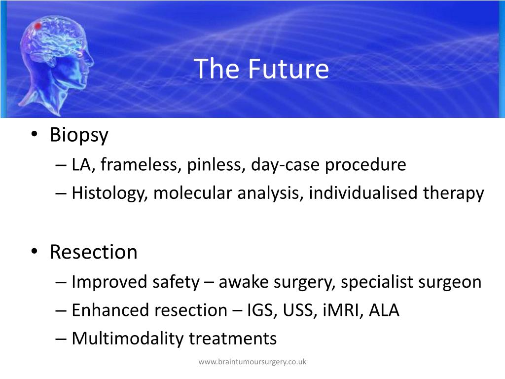 The Future • Biopsy • LA, frameless, pinless, day-case procedure • Histology, molecular analysis, individualised therapy • Resection • Improved safety – awake surgery, specialist surgeon • Enhanced resection – IGS, USS, iMRI, ALA • Multimodality treatments www.braintumoursurgery.co.uk