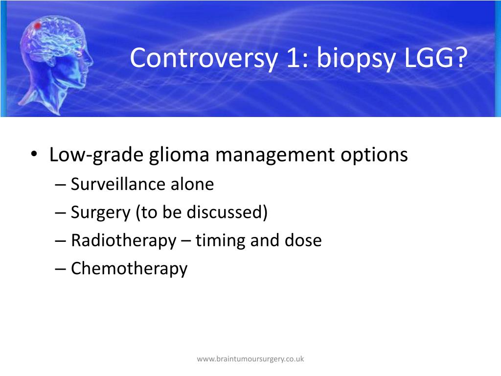 Controversy 1: biopsy LGG? • Low-grade glioma management options • Surveillance alone • Surgery (to be discussed) • Radiotherapy – timing and dose • Chemotherapy www.braintumoursurgery.co.uk